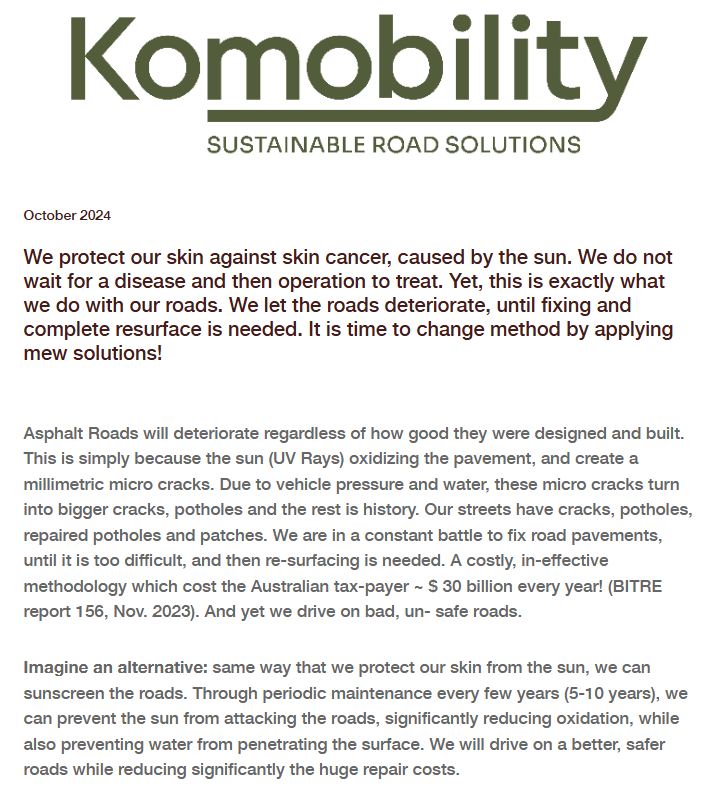 We protect our skin against skin cancer caused by the sun. We do not wait for a disease and an operation to treat it. Yet, this is precisely what we do with our roads. We let the roads deteriorate until fixing and complete resurfacing are needed. It is time to change methods by applying new solutions!